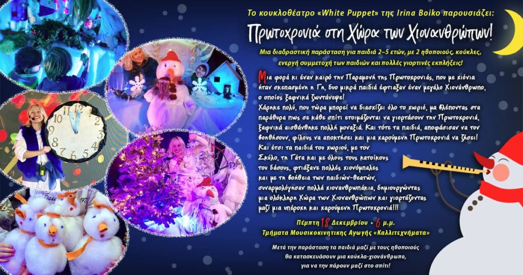 Μετά την παράσταση τα παιδιά μαζί με τους γονείς θα κατασκευάσουν μια κούκλα-Χιονάνθρωπο για να την πάρουν μαζί στο σπίτι!