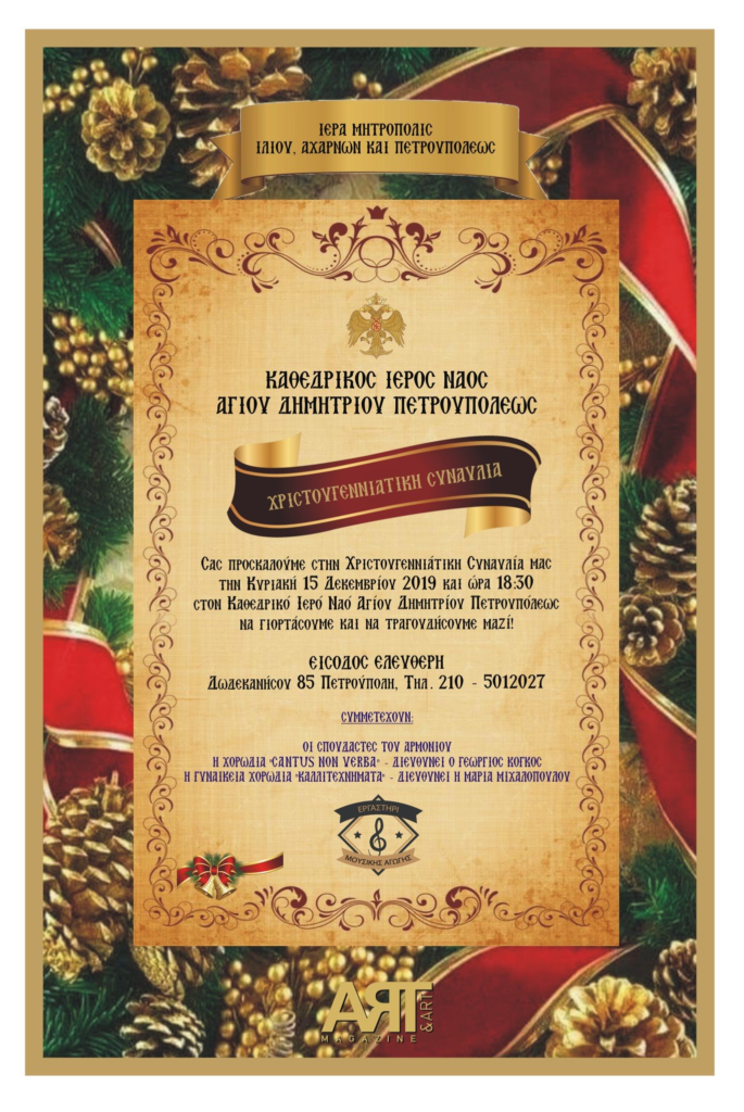 Με μεγάλη επιτυχία πραγματοποιήθηκε η Χριστουγεννιάτικη συναυλία του Καθεδρικού Ναού Αγίου Δημητρίου Πετρουπόλεως, την Κυριακή 15 Δεκεμβρίου 2019, που επιμελήθηκε ο Μουσικοδιδάσκαλος και Πρωτοψάλτης κ. Νικόλαος Αμοργιανός.
