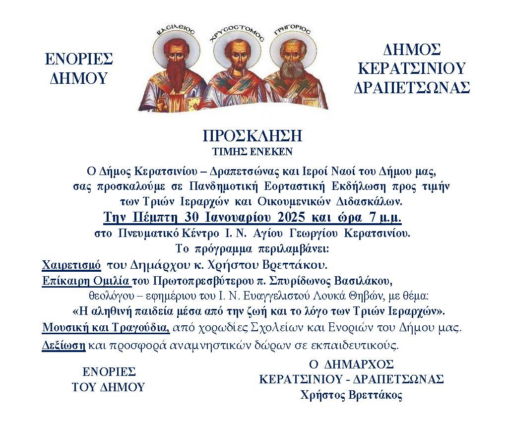 Η Χορωδία Καλλιτεχνήματα θα συμμετάσχει στην Εορταστική Εκδήλωση προς τιμήν των Τριών Ιεραρχών και Οικουμενικών Διδασκάλων του Δήμου Κερατσινίου – Δραπετσώνας που θα πραγματοποιηθεί την Πέμπτη 30 Ιανουαρίου στις 7 μ.μ., στο Πνευματικό Κέντρο I. Ν. Αγίου Γεωργίου Κερατσινίου.