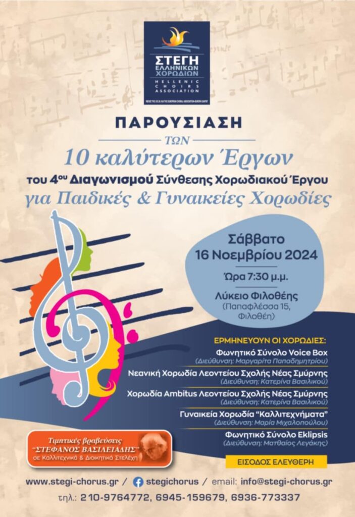 Τα «Καλλιτεχνήματα» συμμετέχουν στην Εκδήλωση Παρουσίασης των 10 Καλύτερων Έργων για Παιδικές & Γυναικείες Χορωδίες του 4ου Διαγωνισμού Σύνθεσης που θα πραγματοποιηθεί το Σάββατο 16 Νοεμβρίου, στο Λύκειο Φιλοθέης και διοργανώνει η Στέγη Ελληνικών Χορωδιών!