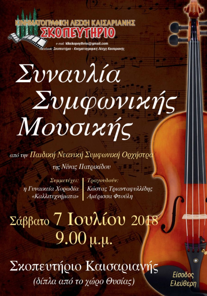 Η Κινηματογραφική Λέσχη Καισαριανής – «Σκοπευτήριο», διοργάνωσε υπαίθρια συμφωνική συναυλία κλασικής μουσικής με την Παιδική-Νεανική Συμφωνική Ορχήστρα της Νίνας Πατρικίδου με τη συμμετοχή της πολυφωνικής Γυναικείας Χορωδίας «Καλλιτεχνήματα», το Σάββατο 7 Ιουλίου 2018, δίπλα στο χώρο Θυσίας του Σκοπευτηρίου.