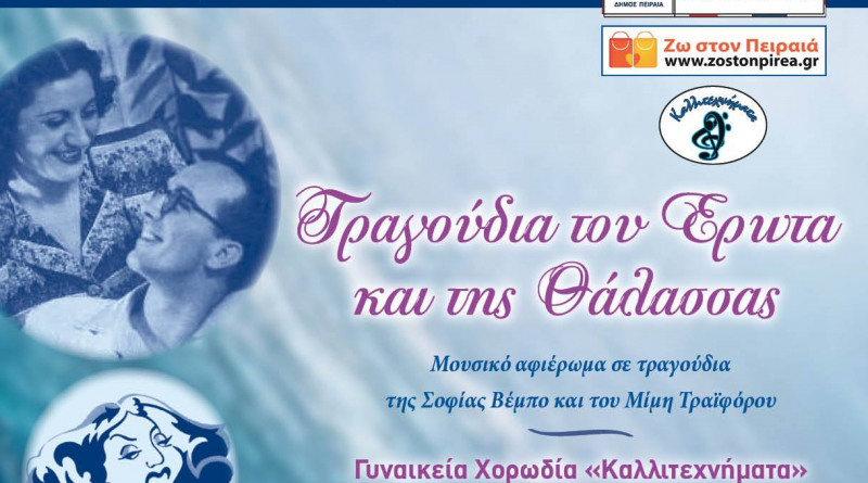 Η «Γυναικεία Χορωδία Καλλιτεχνήματα» υπό τη διεύθυνση της Μαρίας Μιχαλοπούλου δε θα μπορούσε να λείπει από το υπέροχο μουσικό αφιέρωμα σε τραγούδια της Σοφίας Βέμπο και στον Πειραιώτη Μίμη Τραϊφόρο, με τίτλο «Τραγούδια του Έρωτα & της Θάλασσας!».